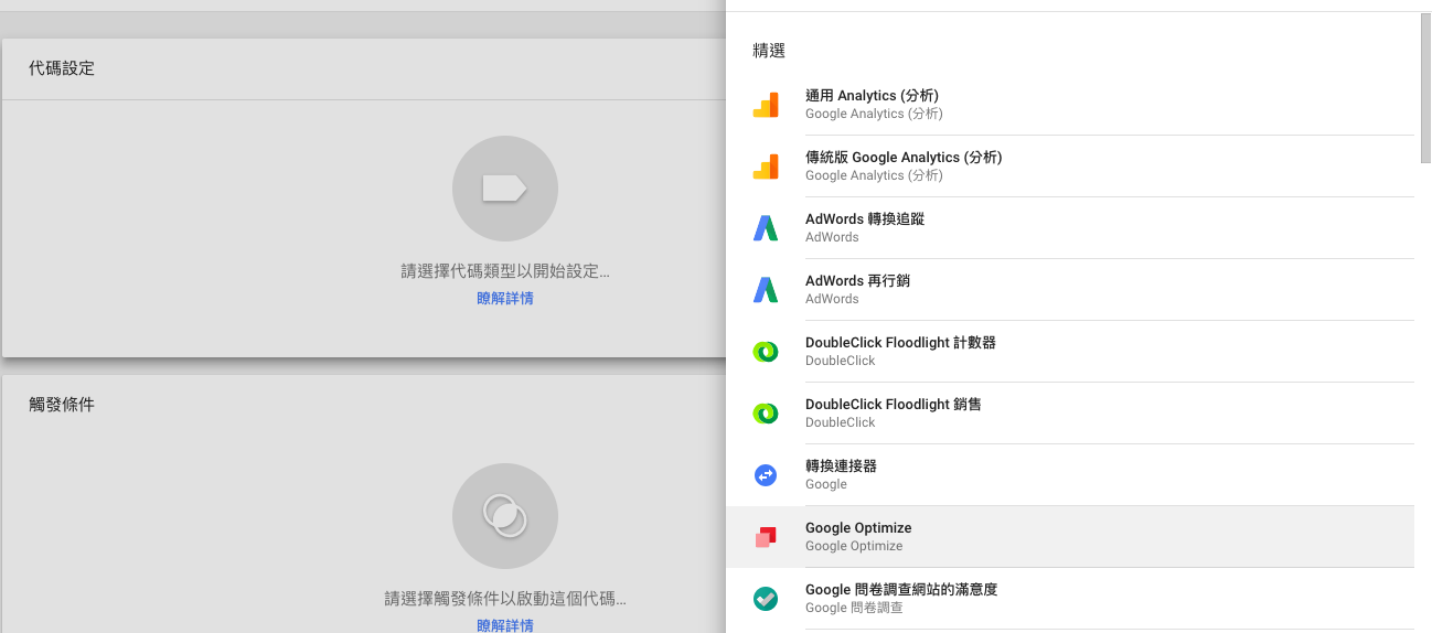 4. 到GTM安裝代碼:選擇Google Optimize,開始新增 簡單安裝影片教學